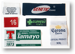 Etiquetas bordadas en tafeta, damasco, sarga, galon, pueden ser en rollo, cortadas, con doblez a la mitad, doblez a las orillas. Tambien fabricamos parches con corte laser y pulseras.