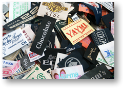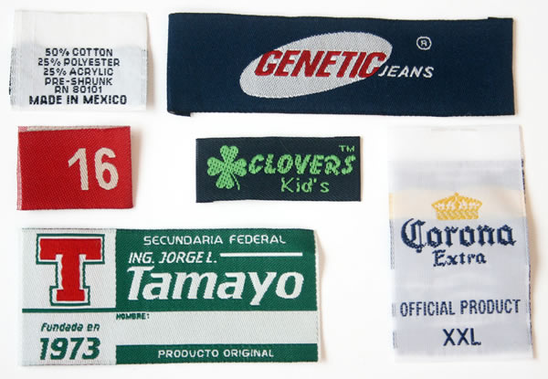 Etiquetas bordadas en tafeta, damasco, sarga, galon, pueden ser en rollo, cortadas, con doblez a la mitad, doblez a las orillas. Tambien fabricamos parches con corte laser y pulseras.
